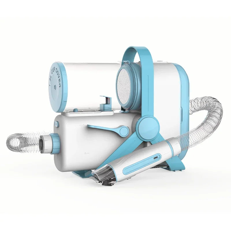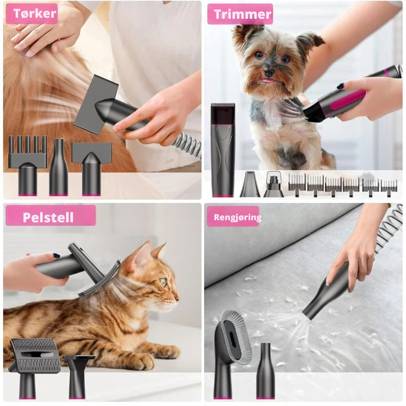 Denna uppgraderade modell kombinerar dammsugare, tork och trimmer i en och samma enhet, så att du kan klippa, borsta, torka och samla upp allt hår – utan stress, stök eller oväsen.